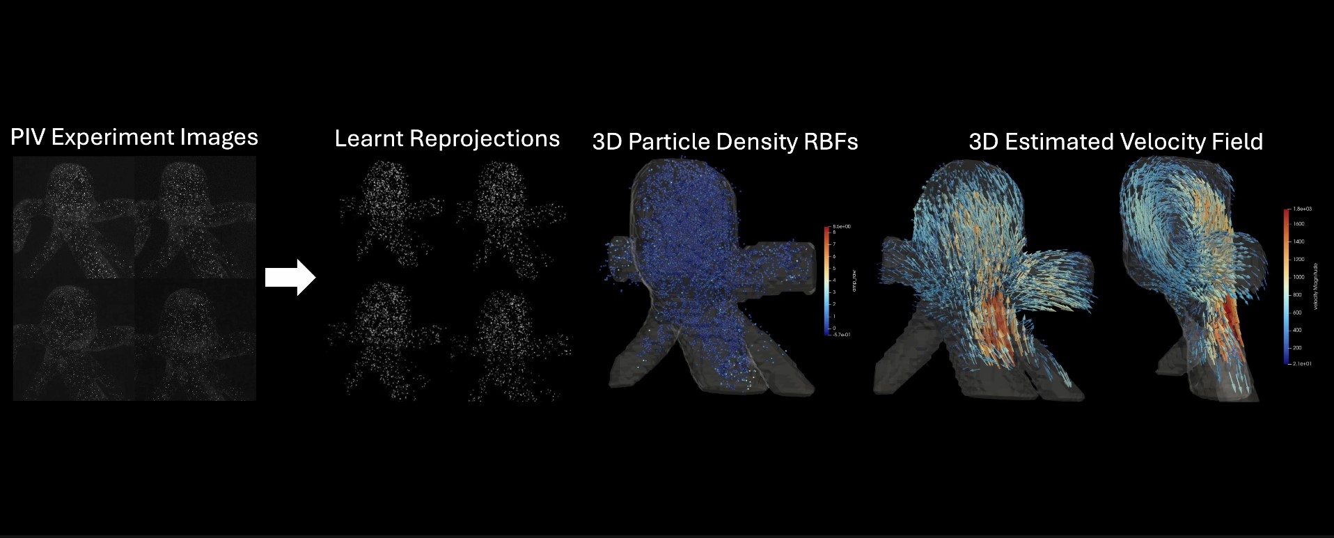 This project develops an end-to-end differentiable formulation for volumetric PIV that jointly estimates camera mapping refinements, a continuous 3D particle-density field, and an Eulerian velocity field. The particle density is represented as a sum of Gaussian kernels that can be rendered analytically to each camera view using Gaussian splatting.
